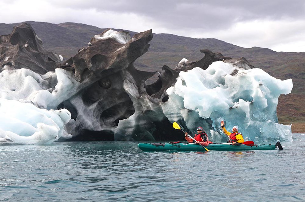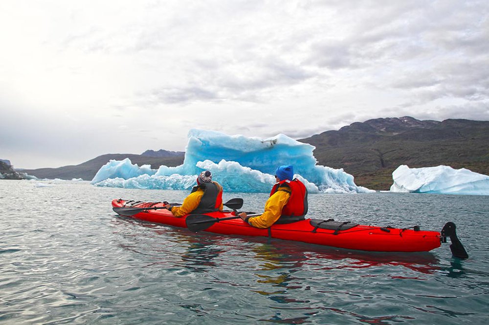 Começamos cedo aquele que vai ser um dia cheio. Saltamos a bordo de um pequeno barco alugado para o nosso grupo, e cruzamos o fiorde de Tunulliarfik que fica à nossa frente. Desembarcamos em Qassiarsuk, uma povoação típica da Gronelândia, onde visitamos as ruínas vikings de Brattahlid. Depois, colocamos as mochilas às costas e damos início a um trekking que nos vai levar pelas paisagens do Ártico até Tasiusaq, um povoado ainda mais pequeno do que aqueles por onde temos passado. Tasiusaq é um lugar absolutamente tranquilo e surreal, onde a ideia da Gronelândia coberta de gelo e icebergues contrasta com a realidade preenchida por campos verdejantes e flores rosa e lilases que ladeiam o caminho, dando-lhe um ar completamente idílico. Instalamo-nos no albergue onde vamos passar a noite e por aí ficamos um pouco a descontrair e usufruir da paisagem que o envolve. De seguida, pegamos nas pagaias, para navegarmos de kayak numa baía preenchida por icebergues. O percurso não exige experiência prévia e, embora não apresente dificuldades, vai dar-te uma perspetiva inesquecível do Ártico, ao navegares de kayak por entre os icebergues que flutuam nas águas, como fazem os inuit há já muitos séculos. Foram eles que inventaram o kayak, que se tornou um meio de transporte fundamental para as suas comunidades, e teve um papel determinante na sua subsistência, permitindo-lhes desenvolver a caça à foca e à baleia.