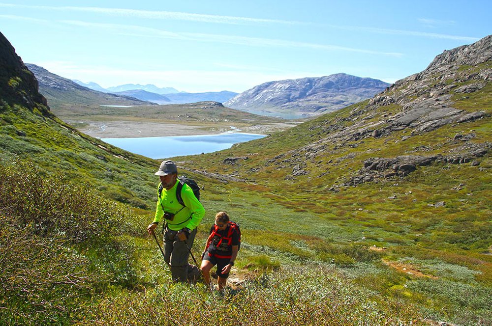 Acordamos para mais um dia de trekking. Começamos a progressiva subida que nos leva ao plateau sobre o fiorde gelado de Qooroq. Esta é uma das vistas mais memoráveis e extraordinárias do sul da Gronelândia. Depois de contemplarmos a vista sobre o fiorde, iniciamos a descida ao Blue Ice Camp. Já lá em baixo, na baía onde os icebergues se acumulam, vamos caminhar sobre o gelo, para depois apanharmos mais um barco que nos vai levar a Narsaq. Agora numa cidade de maior dimensão, vamos sentir-nos de volta à civilização.