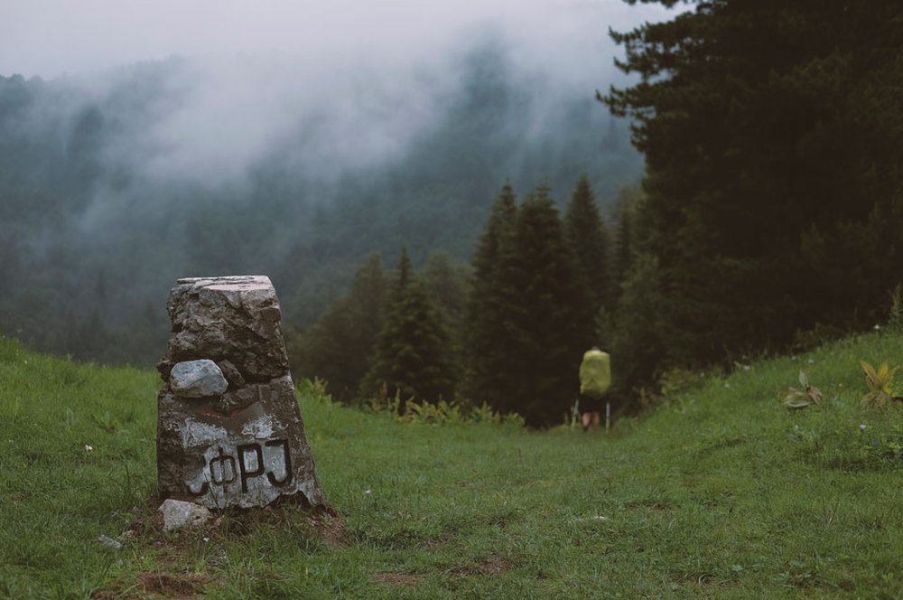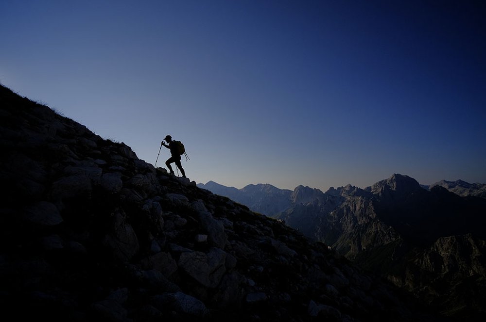 Enfrentamos um terreno intimidante e inclinado. Sem pressas, com o apoio dos bastões e empenhando alguma dose de perseverança, chegamos ao topo assinalado com um marco de fronteira. A compensação do esforço vem sob a forma de vistas avassaladoras sobre o canhão de Skirpa e os cumes montanhosos de Montenegro.