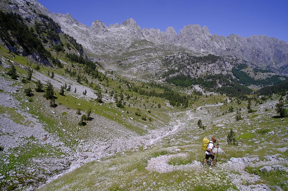 O dia começa com o primeiro grande desafio deste trekking: alcançar o colo de Prosllopit (2030m). Seguimos por trilhos centenários, criados por pastores locais, que trespassam bosques alpinos e pradarias verdejantes. Ao subir o vale, alcançamos um singular abrigo de pastores onde nos detemos para apreciar as vistas sobre o pico Zla Kolata (2534m) - um dos mais emblemáticos picos dos Alpes Albaneses - e o Maja Roshit (2525m). A partir deste ponto, a floresta começa a rarear e, à medida que ganhamos altitude, a paisagem torna-se árida e rochosa.